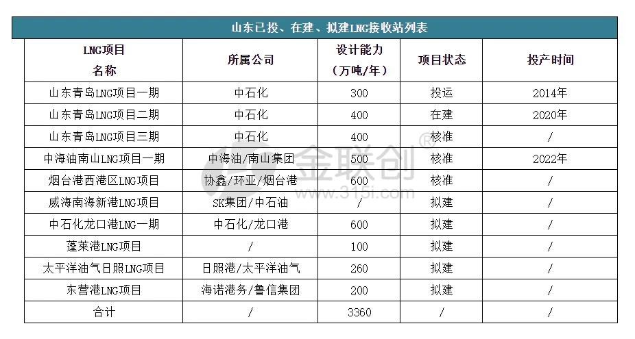 從上表可看出,山東省規劃沿海LNG接收站項目數量眾多,截至目前統計,若在建、擬建LNG項目全部投產后,山東省LNG接收站接收能力將達到3360萬噸/年。
