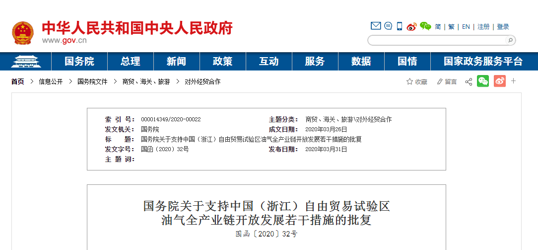 國(guó)務(wù)院關(guān)于支持中國(guó)(浙江)自由貿(mào)易試驗(yàn)區(qū)油氣全產(chǎn)業(yè)鏈開(kāi)放發(fā)展若干措施的