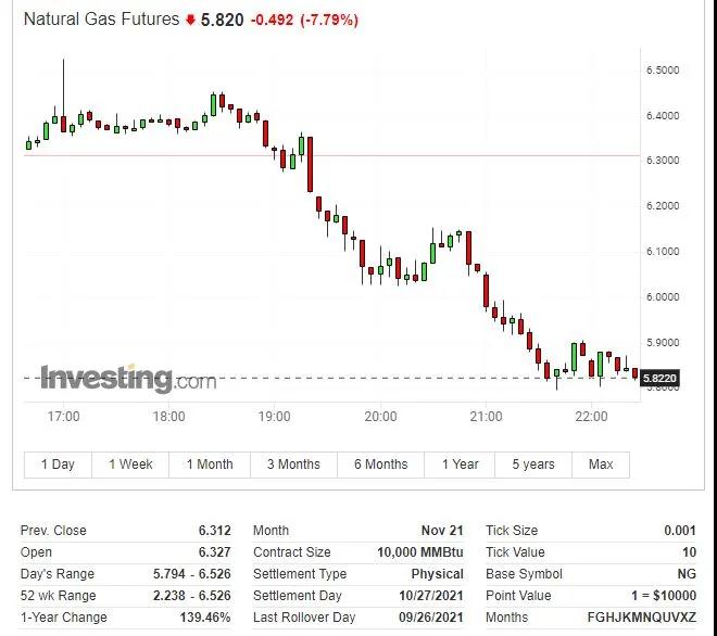 美國天然氣期貨11月合約短線下跌8.3%,創(chuàng)今年以來最大跌幅,隨后跌幅維持在逾7%,失守6美元/百萬英熱單位的關(guān)鍵整數(shù)位,周二曾收于6.31美元/百萬英熱單位,創(chuàng)2018年12月來最高。