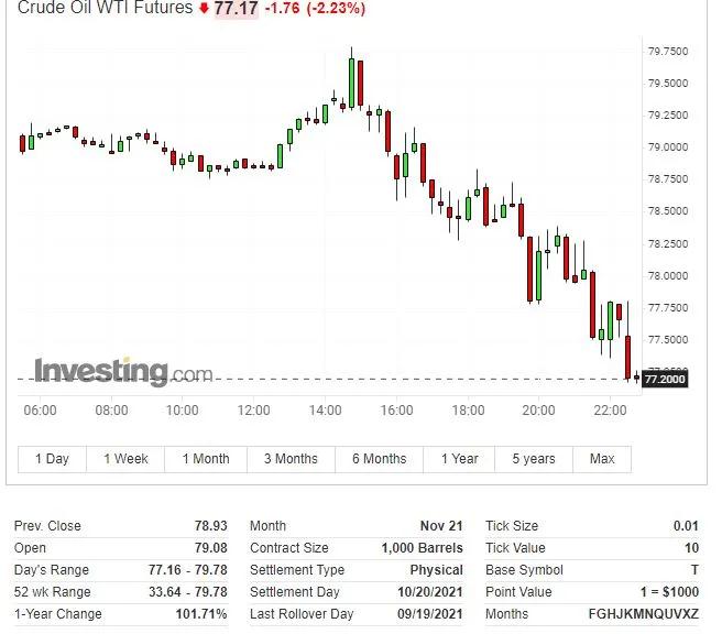 同樣,作為冬季供暖和工業(yè)發(fā)電替代品的國際油價應(yīng)聲下挫。美油WTI從日高接近80美元處短線回落2.62美元至日低,并下逼77美元,日內(nèi)轉(zhuǎn)跌并跌超2%,從近七年最高回落。