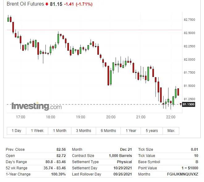 國際布倫特油價也從日高逾83美元處短線回落2.66美元至日低,并跌破81美元關(guān)口,日內(nèi)由漲超1%變?yōu)榈?%,從2018年10月以來的三年高位回落。