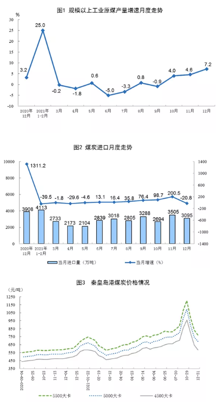 原煤生產繼續加快,進口由增轉降。隨著增產保供政策持續推進,12月份,生產原煤3.8億噸,同比增長7.2%,增速比上月加快2.6個百分點,比2019年同期增長10.7%,兩年平均增長5.2%,日均產量1241萬噸;進口煤炭3095萬噸,同比下降20.8%。
