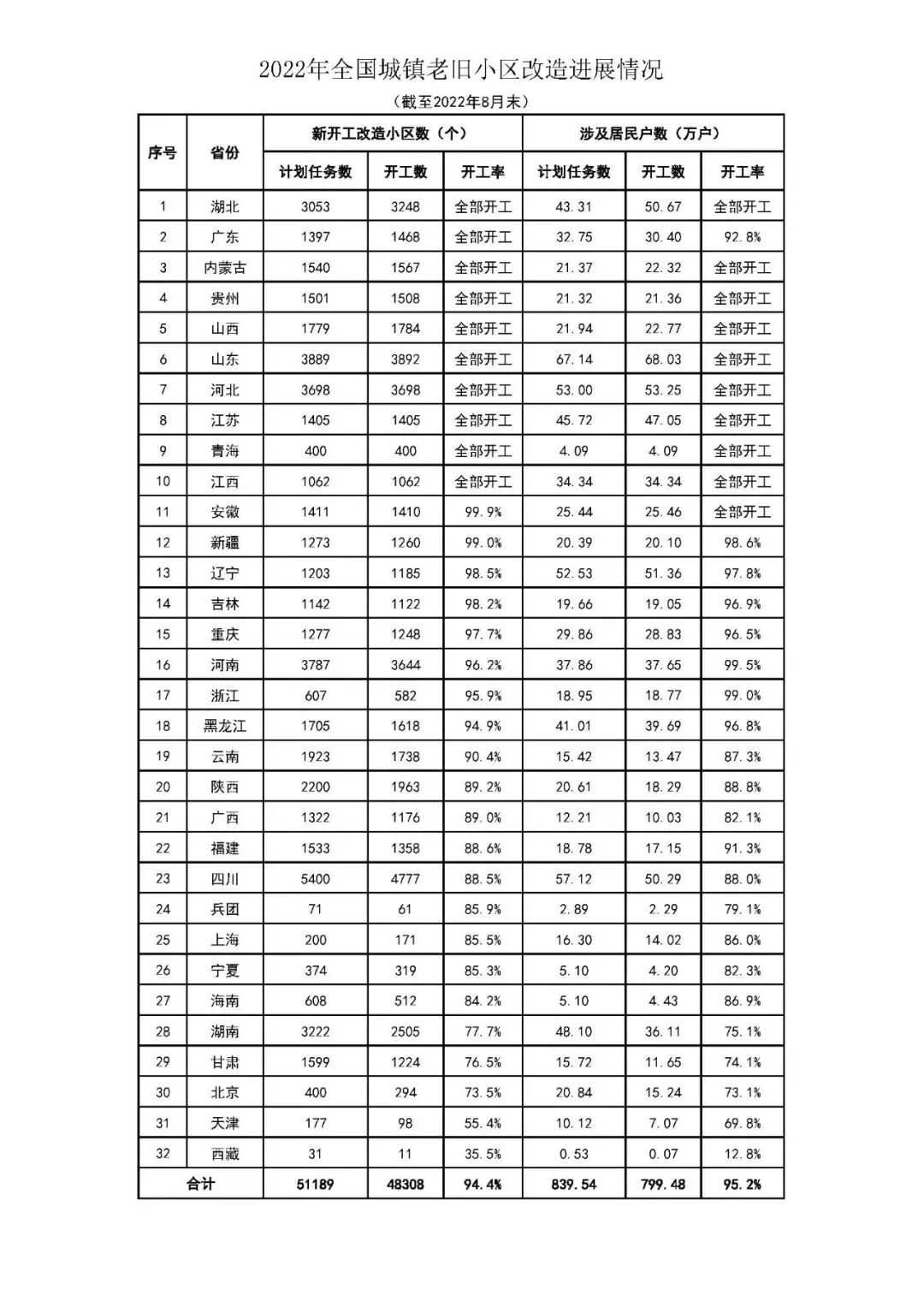 2022年1-8月份,全國新開工改造城鎮老舊小區4.83萬個、799萬戶,按小區數計占年度目標任務的94.4%。其中,湖北、廣東、內蒙古、貴州、山西、山東、河北、江蘇、青海、江西10個省(自治區)新開工改造城鎮老舊小區完成年度計劃任務。