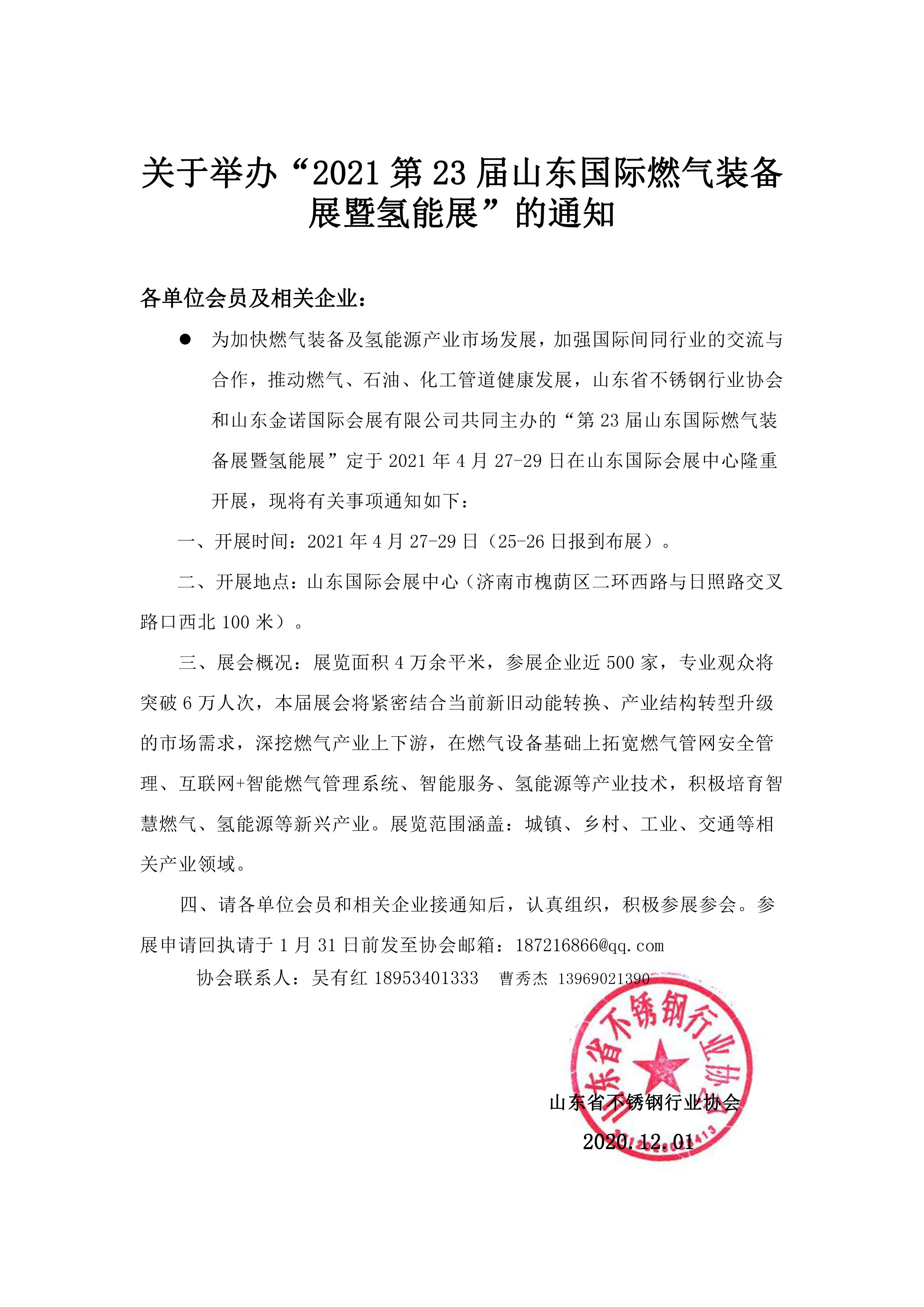 山東省不銹鋼行業(yè)協(xié)會(huì)組團(tuán)參加2021山東國(guó)際燃?xì)庋b備展
