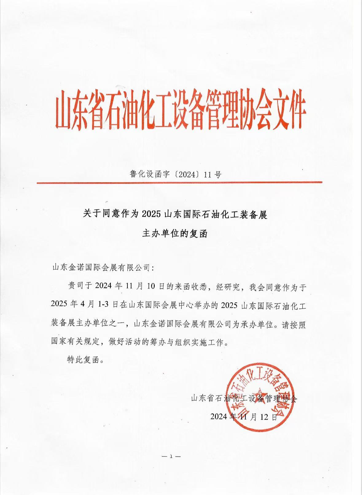 山東省石油化工設備管理協會關于2025山東國際石油化工裝備展聯合主辦復函